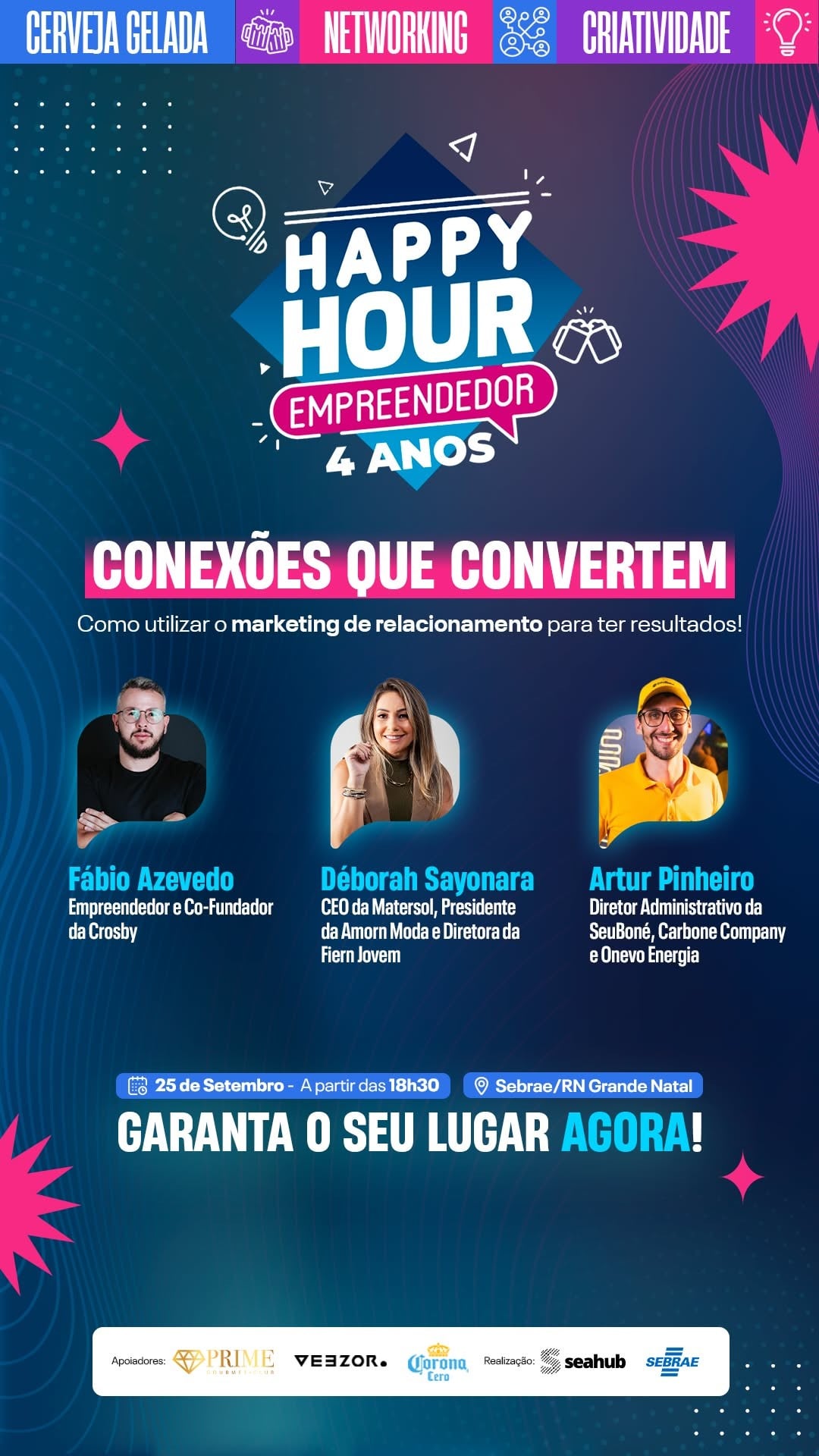 Por isso, anote na agenda: a edição especial do Happy Hour Empreendedor acontecerá no dia 25 de setembro, na Agência Sebrae Grande Natal.